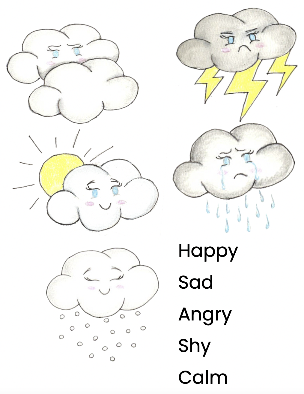 For “The Way Sky Feels”: This book is all about helping children recognize feelings and emotions all while helping them find ways to express those feelings and emotions. This activity specifically helps children to recognize and differentiate the different emotions that Sky goes through in the story. What the children will be doing here is matching the image of Sky’s feelings with the word given. To specify, a child would take Sky’s sunny, happy self and match it with the word “happy.” The other emotions the children will have to match are sad, shy, calm, and angry. It is a fairly simple and quick activity. Some children may need guidance especially if they can’t read. The document these words and images can be printed from will be attached.